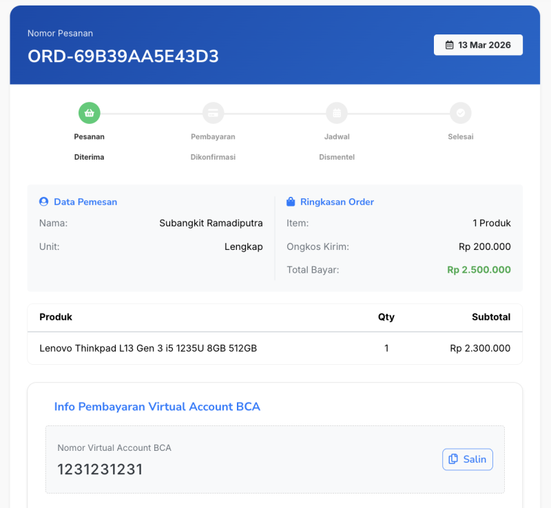 Informasi mengenai waktu pembongkaran (dismantle) dan kesiapan unit tidak dipatok di satu tanggal, melainkan dapat dipantau secara mandiri melalui menu pelacakan dengan memasukkan NPP dan memilih Order Number yang sesuai.